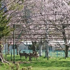 番外編です。 若鹿たちもお花見です。 神社の境内ですが、 野生のエゾシカです😅 萌芽した草を食べていました。