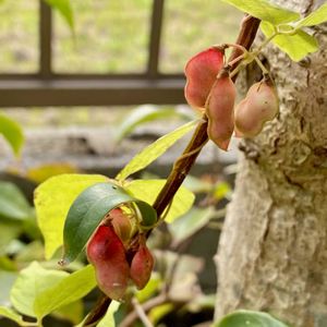 庭のトキリマメが種を蒔いて数年、初めて実をつけて色づき始めました。 真っ赤になるまでもう少し。