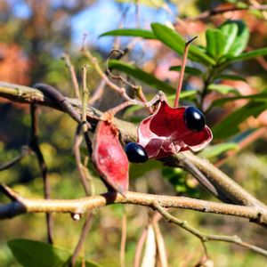 12月21日 赤くなった鞘が割れてツヤツヤの黒い種が見えているトキリマメ。 今年はトキリマメもノササゲも花は「どんだけ〜」っていうくらい咲いていたのに、豆になったのはがっかりするくらい少なくて。 やっとトキリマメはかわいい姿に会えました(^^) (ノササゲは残念ながら綺麗な色には会えませんでした) トキリマメが絡んでいる木も綺麗に色づいていました♪♪