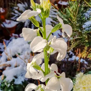 今朝の庭から 1️⃣ストック 2️⃣カルーナ 3️⃣クリスマスツリーみたい🤭 4️⃣庭の雪 雪は年に2、3回程度しか積もることないけど、昨日の天気予報が当たってました。