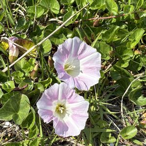 ハマヒルガオ 🌱ヒルガオ科 ヒルガオ属 ✽つる性の多年草で茎は地表を這って伸び、マット状に群生することが多い ✽厚く光沢のある葉は腎円形で全縁、円頭または凹頭 ✽花冠はやや五角形の熨斗状で径と長さは5cmほど ✽苞はがく片と同長 ✽雄しべ5個、雌しべは1個 浜辺を散策して来ました♪🩷