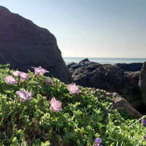 岩場のあちこちに葉っぱが這っているけれど、花の数は控えめ。種差海岸の岩場はいろんな植物と譲り合って咲いているよう😊