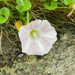 ハマヒルガオ(浜昼顔) ヒルガオ科 ヒルガオ属 5~6月 つる性 在来種 多年草 海岸砂地に生育し、地下茎を長く伸ばして増える 葉は互生し長さ2~4cm、幅3~5cmの腎円形で基部は深い心形 葉質は厚く光沢がある 花径4~5cm 花色はふつう淡紅色🩷 白花もみられた🤍 岩上に咲く姿は力強いですね😊