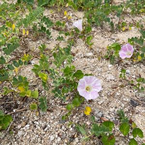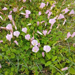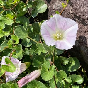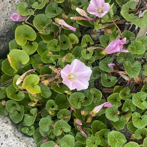 ハマヒルガオ ヒルガオ科ヒルガオ属 5~6月 つる性 多年草 海岸砂地 海岸砂地を這って伸長し、茎長1~5mほどになります。 腎円形で肉厚の葉も特徴的😊 3枚目は真っ白なシロバナハマヒルガオ🤍 何歳になっても初めてはドキドキ🤭 シロバナは今回が初見で、何とも言えないのですが、桃色の子はまだポツリポツリと咲き始めた感じのところ、シロバナは数が多く咲いていて、周囲を見る限りシロバナが僅かに早く開花するのかな…と感じました。 もちろん株数は少ないですが。。。😌 あちこちに点在しているわけではなく、数ヶ所で地下茎で広がっている様子でした。