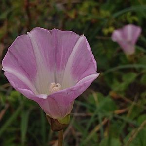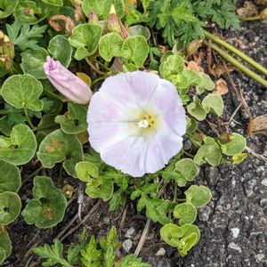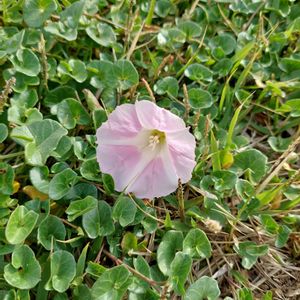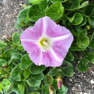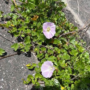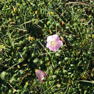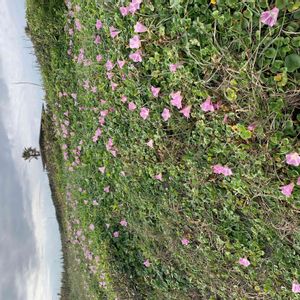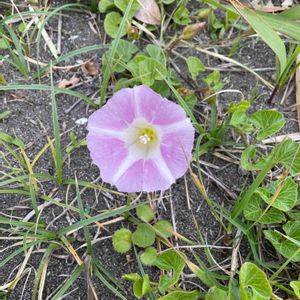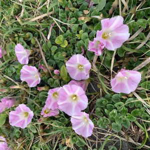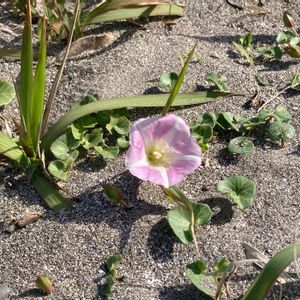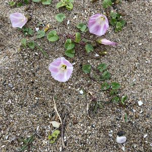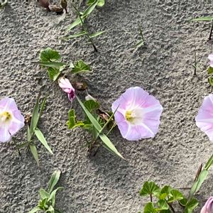 ハマヒルガオです。 自然大好き派😘です。我が家の近くの人工海浜に来たらご覧のようにもう咲いていました。まだ数はちらほらですが、咲き始めましたなので清楚な感じがしました😅。砂地から直接花が咲いているように見えます。普通の朝顔のようなツルは見えません。 なお、後ろのコウボウムギも代表的な海浜植物です。