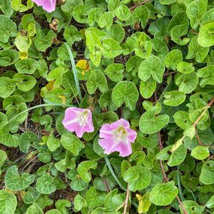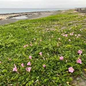 茅ヶ崎の柳島海岸でハマヒルガオが群生してます。見頃です! 育ててますって看板が立ってました。