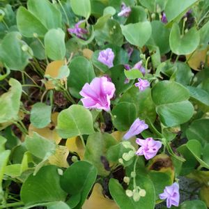 ハマヒルガオ (浜昼顔) 🌿ヒルガオ科 ✽つる性の多年草で茎は地表を這って伸び、マット状に群生することが多い ✽厚く光沢のある葉は腎円形で全縁、円頭または凹頭 ✽花冠はやや五角形ののし状 浜辺を彩っていました💗💗💗