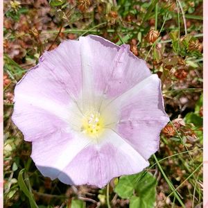 朝顔のような花なのですが 蔓は見られなかったようで 地面にポツポツ ポツポツと咲いていました。場所は空き地です。 葉の形からハマヒルガオのようです。