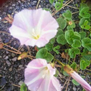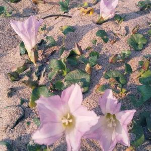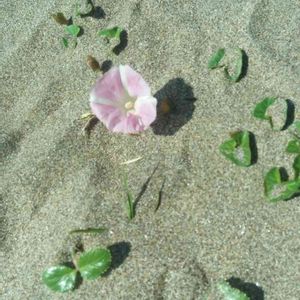 ハマヒルガオ(浜昼顔) 数年前の5月にガラケーで撮ったpicが出てきたので投稿させて頂きます。 寒いので、これを見ると少しは暖かくなると思って(笑) 5月から6月に、海岸の砂地に生息する多年草です。 北海道から沖縄、海外にも広く分布しています。 花茎4~5cmの淡い紅色の花。 俳句の季語は、夏です。 あと、少し寒さに我慢したら、すぐに暑くなります。寒いけれど皆さま、頑張りましょうね☀