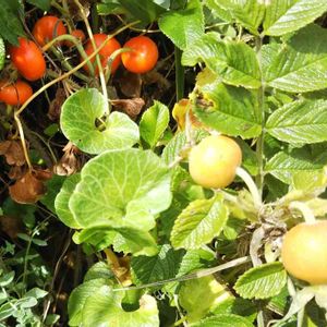 「ハマナスの実」 とハマヒルガオの葉っぱ 中央のツヤツヤまるっこいのがハマヒルガオ、好きなんですこの葉っぱ✨