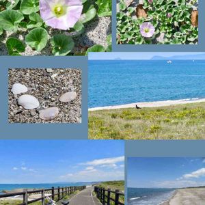 夏の日差し、春の風 真っ青な空を映して海の青が凄いのです✨ 爽やかなサイクリング日和です🚴♀️ 吹上浜のサイクリングロードを走りました♡♪ 砂浜に朝顔の様なお花が咲いていました♡