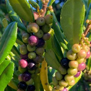 大好きな海辺散歩道は自宅から車で20〜30分。去年も花が終わった頃来た記憶が🙄薄黄緑➡️うっすらワイン➡️黒へと変わっていくようです💜 よく似た姫榊は葉先が尖っています 🏷青い実マニア
