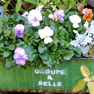 2週間程前に作った寄せ植え ミックスカラーのビオラ苗 最後の3個、花が付いてなくて 半額。しっかりした苗で、蕾あり。やっとミックスで咲き出しました。ポットは、道具入れにしていたもの。底穴を開けて使用他、葉物シロタエギク、ツルニチニチソウ 、セダムなど