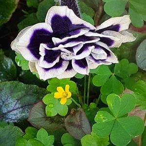こんにちは(*^^*) 朝イチ撮れたて便(9時頃) 水遣りの後 ペチュニアの鉢植えの下で オッタチカタバミが咲いていました。面白いコラボ