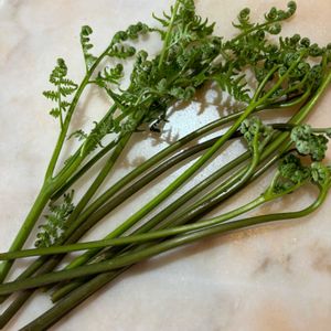 秋わらびです。 雨の切れ目に庭の見回りで、見つけた。 湯通しして、鰹節削りで。 取り立てだから、シャキッとしていて、ねっとり