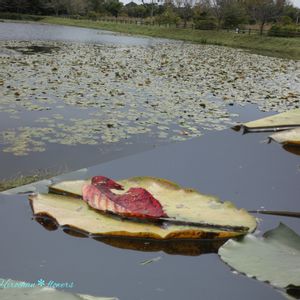 「蓮池にて🍂」 蓮の葉っぱが 落ち葉🍂をナイスチャッチ🤗 🏷️水辺の水曜日に、 参加します😉