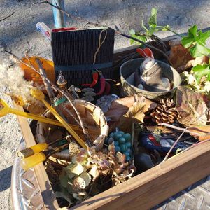 【骨董と花生活 月曜日】 クヌギ・カキ・サクラ・ケヤキ ススキ・ネコジャラシ そしてドングリ・マツボックリ の「ふきよせ」の中に 古い物が、、、 古布の手帳カバーや兎人形 簪(カンザシ)&笄(コウガイ)は 目立ちますが 下記の物が隠れています❗ ガラス製の 🐫の小物 ドアノブ 陶器の 小鳥の笛 超ムズカシイ兎三匹 銀色&赤目の白石&銅製 トトロのサツキ&メイちゃん 正面手前にある パッチワーク袋&ハサミは 便利で大活躍!