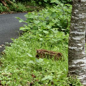 左側の雑木林に向かって植物の写真撮っていたら、なんか唸り声が聞こえた。 次の瞬間、めっちゃデカいよく肥えたイノシシの親が、道の右にある川の方から登ってきて、道を横切り雑木林へ走り去った。 私との距離は約10m。 寿命が縮んだ。 もしかしたら子どももいるかもと思い、しばらく待っていたら、やはり居た。 私の姿を見つけては逃げ、また戻りを三回くらい繰り返して、やっと親のいる雑木林へ走って行った