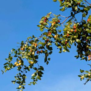 すずなりの「ナツメの実」 乾燥ナツメしか知らなかったけど、近所で見ることができました! 楊貴妃が好んで食べた❤ 一日三個食べると「美容」と「健康」にとてもよくきくそうだ! しかし、庭木にすると、トゲが鋭く扱いにくいらしい、、、