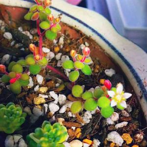 緑ボタンさんとセダムさん💕 ふちがピンクでかわいい