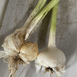 ジャンボニンニク🧄2個収穫。 20個植えて何故か5個しか残ってない⤵︎ 二枚目 去年下葉3枚のを放出したハブさん、大きな割れ葉っぱ🌿出していてびっくり‼️