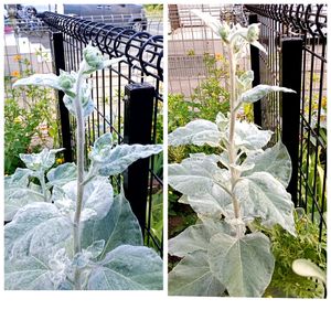 シロタエヒマワリ 銀葉ヒマワリ ①②③シロタエヒマワリ ④⑤ シロタエヒマワリの葉 白妙ヒマワリは最後に咲くヒマワリかな。 綿毛を葉や茎にびっしり付けて、銀色に輝いて見える。シルバーリーフっていうのかな。 綿毛の葉、ラムズイヤーににてるね。