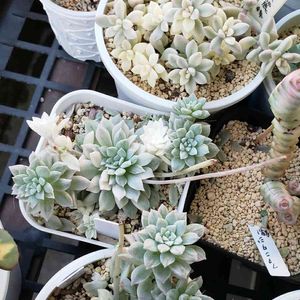 うちの白い子達。 夏に溶けちゃうかなーと心配だったけれど今のところ、元気🌟頑張って夏越えるんだよー! 今のところ、錦系は意外と強いのか元気だけど、クラッスラ系がかなりやられてます…(枯れた) 難しい😣