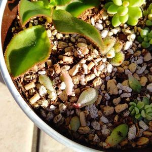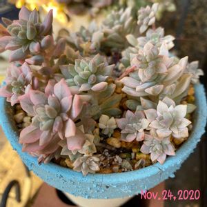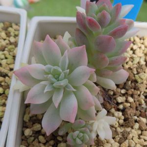 一ヶ月でけっこう色付いたプロリフェラ錦。一つの群生株の中でも色の濃いのや少しだけ色付いたもの,真っ白な小さい株等意外にカラフルで楽しめる。