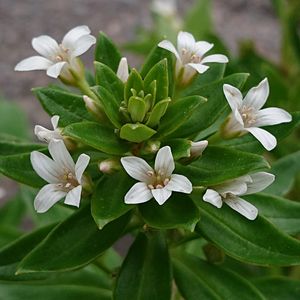 海辺の岩に寄り添う星型の白色のお花さん 海辺に自生していて、葉は多肉質で、花は直径2cmくらい 2021.05.11 野島崎灯台にて