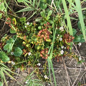 遠目には多肉類かと見えたのですが 葉が陽に焼けただけでしょうか? →ハマボッス、でしょうか