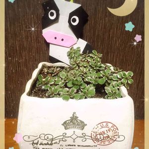 錦の日🏷 牛の日🏷 コラボで参加させて頂きます🐮🌿 斑入りの葉っぱって ミルクをとろ〜り垂らした感じ 葉っぱだから コーヒーや紅茶じゃなくて 抹茶かな? 手前の多肉は 先月のマルシェでの戦利品 王冠マーク👑の 「ウィンドオブチェンジ」 斑入りだ❣️と思って 迷わずカゴに入れました😊 四季を通して元気な「子熊の手袋」 紅葉しはじめた「南十字星」 牛ソニエンちゃんと交換した 牛コスプレコポたんは 柴犬小夏さんから🐸💕 うちの牛ソニエンちゃんは どこかでかくれんぼ中です😅