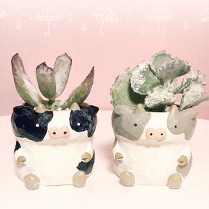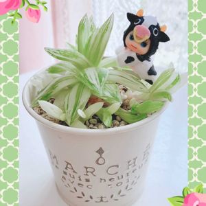 1枚目 🏷️錦の日 🏷️牛の日 斑入りベビーサンローズとけいこさんからの編み編みオヤジさんとピンクの牛さん💕💕 2枚目 🏷️牛の日 ピンクパンサーさんの牛キューピーちゃんカワユス💕よっちゃんからの牛鉢にはセンペルビウムちゃん💕 柴犬小夏さんの牛リメ缶にはちびっ子マッコスちゃん達💕 3枚目 🏷️錦の日 ギムノさん、家の中からお外に出したら、色鮮やかに🧡💚🧡 みたりん産のチキンバブちゃん鉢💕と自作チキンバブちゃん🤣🎶 昨日、デカチキンに食べられかけていた子です!!🤣🤣🎶