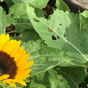 🌻ヒマワリとオンブバッタ🌻 小さいうちは可愛かったオンブバッタ 今では色々な葉っぱを穴だらけにしてしまう😓 あ〜ァ‼️ヒマワリの葉っぱに穴あけましたね😠