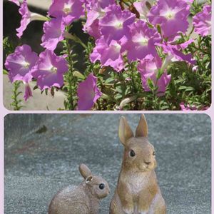 「ペチュニアと可愛いうさぎ」 香色山山麓の五智院、綺麗な色のペチュニアが咲き、その隣に可愛いうさぎの置物が飾られていました。 撮影日 2020.9.15