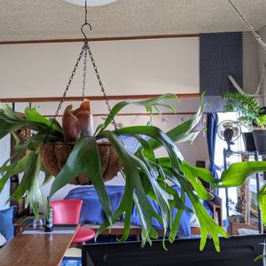 ビカクシダ1号 1月にうちにやってきた時は 小さなヘゴ板に縛りつけられていた。 部屋の壁より 洗面所の明るい窓辺での ぶらんぶらん がお気に召したよう。 さすがコウモリちゃん😏
