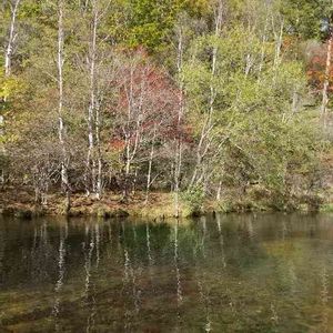 白樺が湖に写って綺麗です。 モミジは少し遅かったようです。