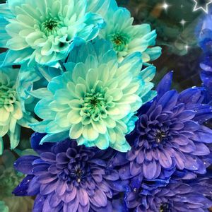 フラワーショップにて。 写真では分かり辛いですが、 キラキラ✨してる切り花💙💜✨ 品種名は「キラキラ・マム」ですって😊✨