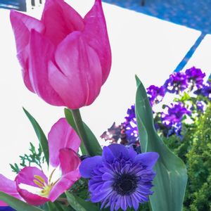 ピンク色のストック💗 ブルーの忘れな草💙 イエローのパンジー💛 春の息吹を感じさせる寄植えです😊 マルナムさん💐 300picおめでとうございます💐🎊🎉🥂🌹🌿🏵🍀 これからも素敵なpicを楽しみにしています😊🎵 🏷青い花とピンクの春2021✨