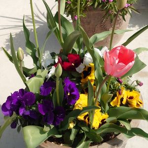 🏷毎月8日は鉢の日🌷 一週間前は蕾だったチューリップも、一気に開花しました😊 紫色、黄色のパンジーとのコントラストが綺麗です😊💗💜💛