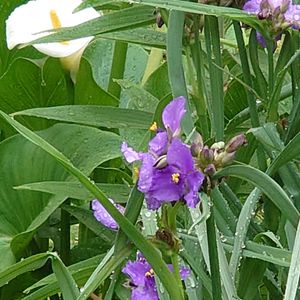5/20㈯④ mimozaさん発信 🏷0の付く日は雨粒の日 ムラサキツユクサが雨に濡れていました。後ろには白いカラーの花が見えています。 🏷青い花マニアも🏷チーム・ブルーもあと少しでキリ番達成です!!