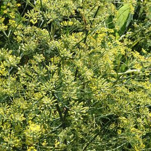 フェンネルは古代エジプトやローマの昔から香辛料や薬草などとして栽培されて来たハーブです。 このpicでは フェンネルの黄色い花は ほぼ終わり 楕円形の薄緑の実が付いていますが 秋には茶色に熟します。 この実(種)はフェンネル シードとして 魚料理などの臭い消しとして使われるハーブです。 また 細い針のような葉も 魚料理の風味付けとして 白く膨らんだ茎は 刻んでスープやサラダに使われます。 ヨーロッパ 中央アジア原産。 セリ科ウイキョウ属の多年草。