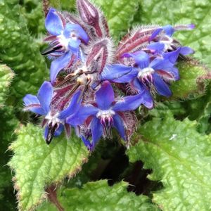 鮮やかなマドンナブルーの星型の花を咲かせるボリジです。 ルリジサの別名でも呼ばれます。 こぼれ種からでも発芽する程 繁殖力があり 通常は初夏から夏に掛けて咲く花ですが 環境が合えば 年中花を咲かせます。 花色は濃いブルーと白(アルバ)があります。 葉っぱの表面は白いもふもふの剛毛で覆われていて 触るとチクチクします。 ハーブであると共にコンパニオン プランツとしても用いられ 近くに植えた植物をマメコガネから防いだり 苺の実付きをよくしたりもするようです。 ヨーロッパ地中海沿岸原産。 ムラサキ科ルリジサ属の1年草。