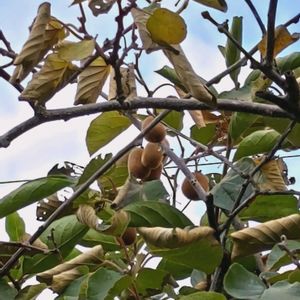 おはよう☀ 今朝の散歩道で…… 今日のお花 「キウイ」 花ではなく実🥝 ご近所さんのキウイの木