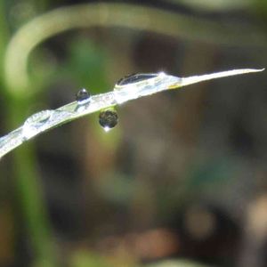 今朝の散歩道。 水元公園の草地の、朝露の💧です。