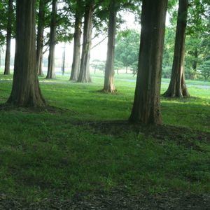 今朝の散歩道。 メタセコイアの森で、休憩中に撮りました。