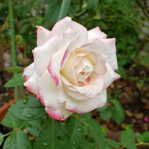 薔薇🌹 ジュビレ デュ プリンセス ドゥモナコ 鉢植えしてましたが調子が悪そうだったので地植えに変えたら一輪咲きました✨ 本来は縁取りが赤色のはずですがピンクになってます🍀 これはこれでいいかなー💞🤗💞