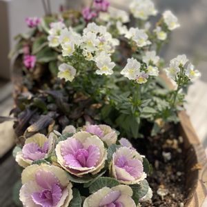 オリガミとクローバーの寄せ植え。 クローバーがだいぶ暴れてるけど可愛く咲いてくれてます😊 オリガミはお気に入りのガーデンシクラメンになりそうです☺️