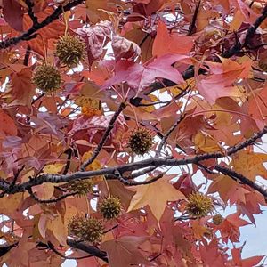 紅葉🍁お散歩① 【モミジバフウ】 紅葉と言えばこの、 モミジみたいなモミジバフウ!!🍁 イガイガな茶色の実もついてました。 でも、カエデでもモミジでもない!フウなんですよね カエデやモミジの仲間は、ムクロジ目ムクロジ科カエデ属。 フウの仲間は、ユリノキ目フウ科フウ属です。 「紅葉葉楓」(モミジバフウ)フウの葉が3裂なのに対し、こちらは5裂で、見た目がカエデそっくり。モミジ(カエデ)とよく似た葉っぱを持つフウ、というのが名前の由来だそう。