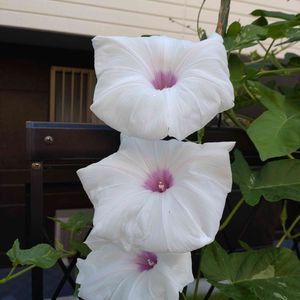 アサガオ 白 今朝は、明け方雨が降らなかったから、アサガオが、ちゃんと咲きました。