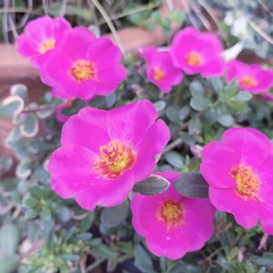 休み休み 気が向いたときだけ ポツポツ咲きます ポーチュラカ マジカルキューティー💠 あまり積極的では無い子 ̨ ̨ ₍⌯́⌓⌯̀ ₎ 私も気が向いたので撮りました٩ʕ๑>᎑<๑ʔ۶ と、全然大きくならないミニ寄せ(鉢は既製品) ずっとミニのままで♡